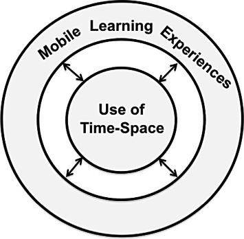 We are not attempting to identify specific causal links between the level of formality of “time-space” and m-learning experiences. However, to discuss distinctive features of mobile pedagogy, we must firstly acknowledge that the organisation of “time-space” in any learning environment profoundly affects m-learning experiences (Ling and Donner 2009). From a socio-cultural standpoint, insights into the organisation of “time-space” in a given learning environment is an essential part of understanding the nature of a m-learning experience, as depicted in Figure 2.