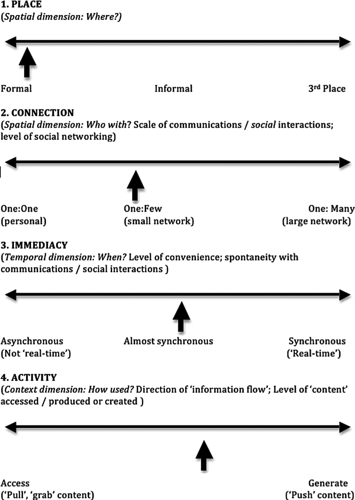 Informed by these processes and mindful of our quest to use socio-cultural theory to capture central pedagogical features of m-learning environments, a framework prototype was designed using four dimensions: place, connection, immediacy and activity. This early version of the framework integrated temporal and spatial considerations. This version was “tested” by using it to critique our student teachers’ use of mobile devices to vote on a controversial issue in a mass lecture (see upward thick arrows on each of the four scales in Figure 3).