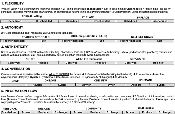 The critical features of these m-learning activities were rated according to our framework using the scales and sub-scales described in Section 5. Hence, (Table 5) (below) provides an indication of the extent to which features of our m-learning framework are exploited. (These ratings do not determine the qualities of the activities per se. Activities are designed for different purposes. Some features of m-learning may be appropriate in some circumstances but not others.).