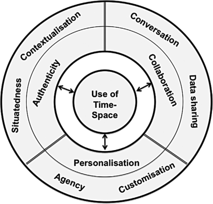 In this section, we describe a rationale for including personalisation, authenticity and collaboration as the three distinctive features of m-learning forming the basis of our current framework, working within our previously discussed conception of “time and space”. We also have formulated two sub-scales for each of these three constructs, as depicted in Figure 6) and described in the subsequent sub-sections. This current graphical representation now consists of circular layers, to show the close, connected relationship between the three constructs depicted in the inner “layer” and the six sub-scales in the outer layer. The bi-directional arrows in the representation depict the previously discussed symbiotic relationship between “Time-Space” and m-learning features.