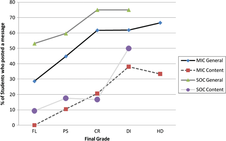 Percentage of students who posted a message on either the general or content-specific forums, relevant to their final grade. FL, fail; PS, pass; CR, credit; DI, distinction; HD, high distinction.