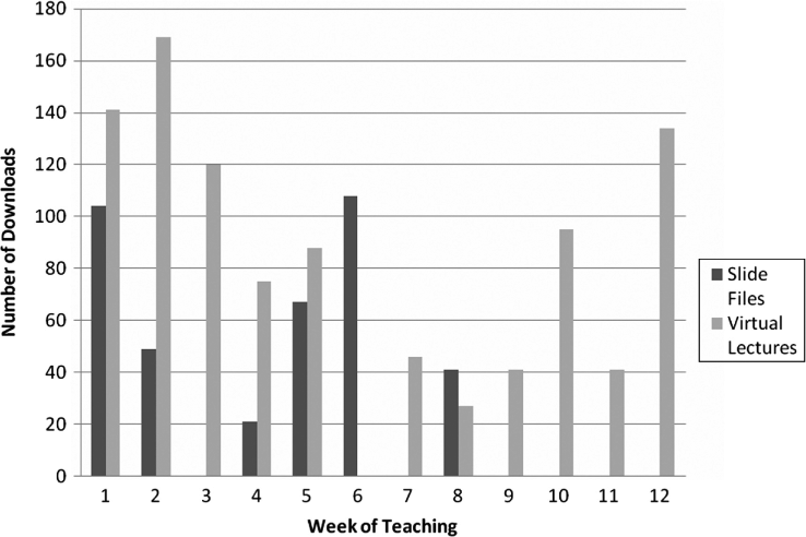 Download patterns for virtual lectures and slides by 101 SOC students during the 12 weeks of the semester.