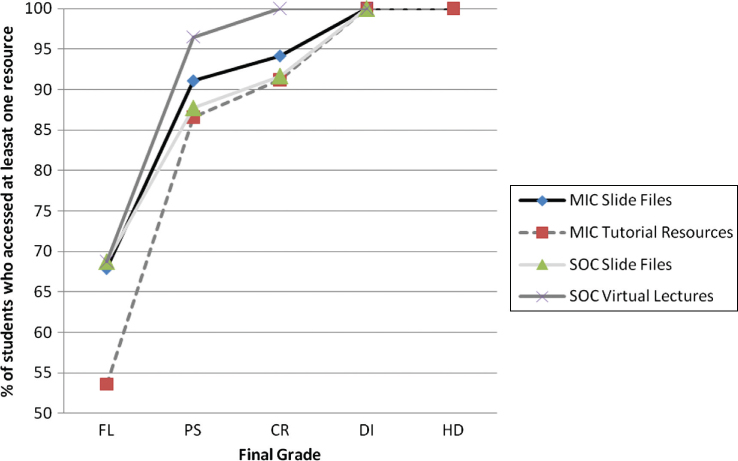 Percentage of students who accessed at least one of the available resources relevant to their final grade. FL, fail; PS, pass; CR, credit; DI, distinction; HD, high distinction.