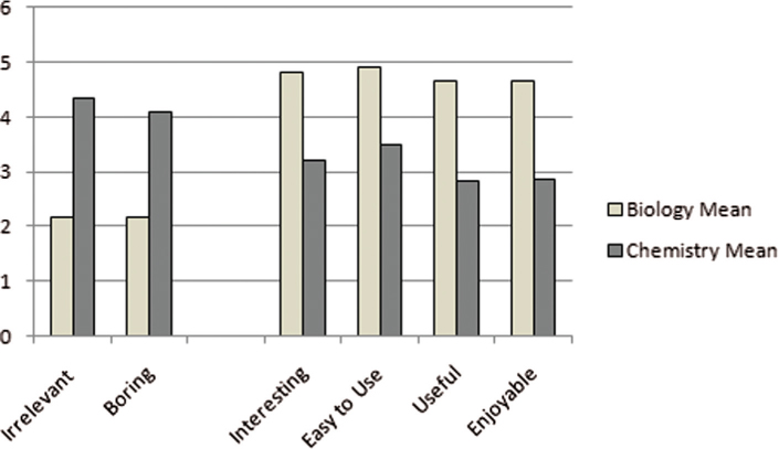 In order to establish students’ broad perceptions of the learning tasks, we asked them to provide ratings of several single-word descriptors (e.g., “interesting” and “useful”), using a 7-point scale (1 = “not at all”; 7 = “extremely”). Overall, the students in the Biology case study gave higher ratings to positive items (“interesting,” “easy to use,” “useful” and “enjoyable”) than they did to negative items (“irrelevant” and “boring”). In contrast, the mean ratings from the Chemistry students who responded to the survey were generally lower for the positive items and higher for the negative items (see Figure 1). As shown in Table 3, a t-test comparing the mean response on each item indicates that Biology students were significantly stronger in their agreement on the four positive items (interesting, easy to use, useful and enjoyable) and Chemistry students were significantly stronger in their agreement on the two negative items (boring and irrelevant).