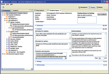 Lightwork is an open source application that complements the assignment functionality already provided by the Moodle LMS (http://moodle.org). It is installed on the user's personal computer (Windows, Macintosh or Linux), and its operations are tightly integrated with Moodle's assignment drop box and grade book. The teacher defines the assignment specifications in Moodle; students submit their work to Moodle and receive their marking results via Moodle. Lightwork takes information on courses and student lists from Moodle. The organisation of marking, the marking itself and the quality control of marking are conducted in Lightwork (Figure 1). Lightwork supports marking teams, by capturing who is marking whom as the basis for progress checking and quality control. Among the reasons for developing Lightwork as a separate application instead as a web-based plug-in were the desire of academics to mark offline and the needs around handling and potentially annotating student work in a variety of application formats.