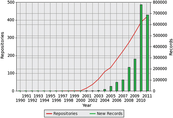 Open Access repositories and records over time, generated at http://roar.eprints.org
