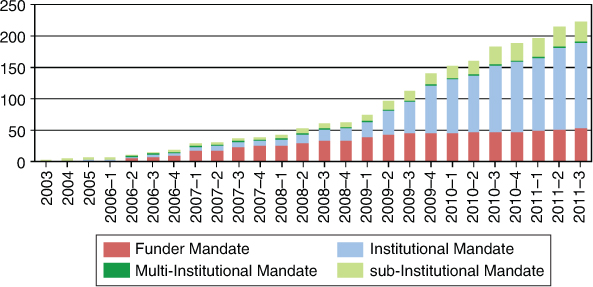 Figure 1 shows the increase in the number of repositories and in the records they hold. The significant jump in records in the last two years can probably be explained by the increase in institutional mandates during that period, shown in Figure 2.