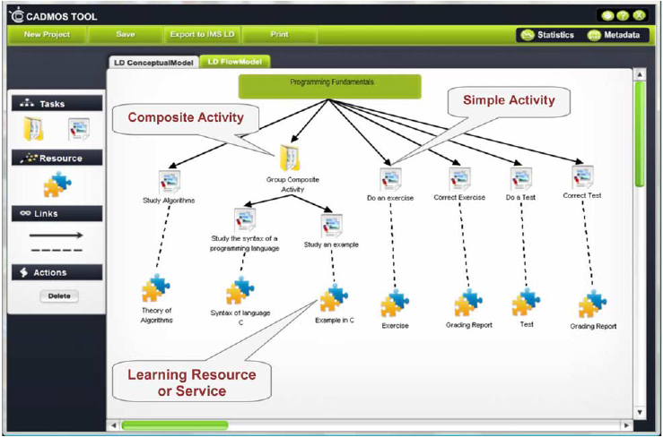 The first activity is a simple learning activity of the “theory” type, which is linked to a hypermedia learning object. The second activity is a composite activity which consists of (1) a “theory” type activity, which is linked to a hypermedia resource that presents the basic commands of algorithms, and (2) an “example” type activity, which is linked to a flash-based learning object. The third and the fifth activity type is “assessment”. They are linked to quiz services. Finally, the fourth and the last activity are “feedback” type activities, which are linked to “hypertext” resources. Figure 1 shows the LD conceptual model designed using the CADMOS tool.