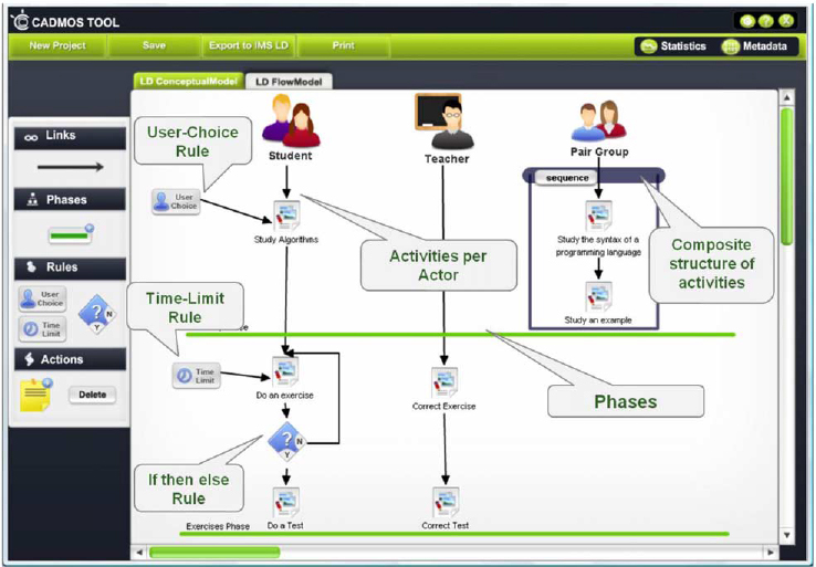 This paper presented the CADMOS tool, a graphical LD editor that is intended to be used by learning designers with basic computer skills and without any technical knowledge of the IMS-LD. The case study showed that this tool allows the easy creation of a LD by specifying and structuring two separate but interrelated models, i.e. the conceptual model, which describes the activities of the course and the corresponding learning resources and the flow model, which describes the orchestration of these activities. This paper discussed CADMOS tool, version 1.6. The tool is being continuously upgraded and newer versions are being released. At the moment, we are working on adding into CADMOS the functionality of exporting its LDs in an appropriate format in order that they can be enacted as online Moodle courses. So, we are examining the mapping among the elements of CADMOS and Moodle. Also, our intention is to add more rules in the flow model, as well as ready-to-use design templates for different learning strategies, such as Think Pair Share (TPS), JIGSAW, PYRAMID and Predict Observe Explain (POE). Finally, our scope is to organize several case studies with teachers for further validating the way CADMOS supports the design process.