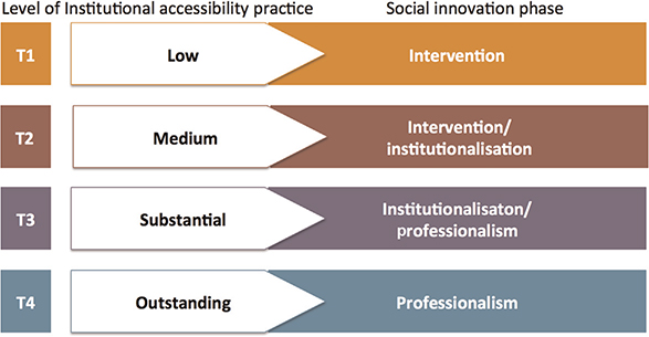 Accessibility has a broad impact that means that as well as systems and software organisations need to consider the policy and indeed philosophy of the organisation towards how it meets the challenge of accessibility. This is captured in the Four-Stage Model of Professionalism in Accessibility (Montandon, Arjona, and Weiermair 2010) shown in Figure 1 and expanded in Table 2. The model can help reflection on organisational direction and offers a way for an institution to benchmark itself against four tiers from initial intervention to professionalism.