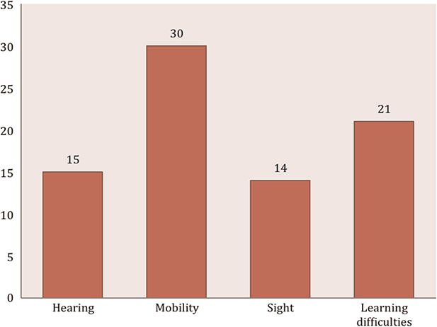 The focus groups and user evaluation activities required disabled students coming into the laboratories to interact with the prototype or to be demonstrated the system. To broaden the base of those consulted, a remote survey of disabled students was conducted to learn more about the perspective of distance learners. Researchers on the EU4ALL project designed the survey that was then managed through the OU Student Survey Team. This meant that the contact lists matched to the overall profile of disabled students at the OU, and recruitment of respondents and conducting the survey online used robust processes. A total of 244 students were invited to take part, and 80 of them completed the survey. The same overall sample was used to find participants for the disabled student focus group and the lab-based studies, both of which required a physical visit to the OU campus resulting in a sample geographically based in the South East of the UK. Participants were excluded from taking part in the survey if they had already been involved in other aspects of the EU4ALL evaluation. Of those who completed the survey, 15 (18.75%) describe themselves as having a hearing impairment; 30 (37.5%) describe themselves as mobility impaired; 14 (17.5%) as visually impaired; and 21 (26.25%) as having a learning difficulty such as dyslexia (see Figure 2).
