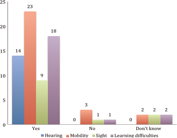 When asked about whether they thought that non-disabled students would benefit from content personalisation, over 85% of the sample mirrored findings from the other evaluation activities by suggesting that they would. An overwhelming majority (more than 96%) of those surveyed felt that increasing the availability of information pertaining to course accessibility was welcome. When asked about the presentation of disability information within the service, 60% of the sample felt that we were asking for the right kind of information about disability. There were not many who disagreed: most of the remainder (about a third) answered “don't know.” This pattern was repeated consistently across disability profiles.