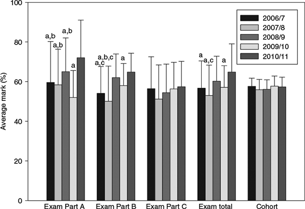 To see whether any differences in the performance of students in the study module were due to variations in cohort aptitude, average marks of other theory modules taken by the study cohort were analysed. There was no significant change in the average cohort performance between 2007 and 2011, indicating that any changes in the study module performance were not due to an unusual cohort.