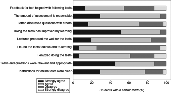 The first survey showed that more than 80% of the class found that the online tests helped their understanding, and they also found the feedback they got for the first part of the test helpful (Figure 5). Around 75% agreed that the questions were clear, and that the first test helped them get better marks in the second test. Just over 60% found the tests moderately difficult and 25% fairly difficult and for the first two tests 55 and 70% of the students, respectively, needed more than one attempt to gain 80% of the marks (data not shown).