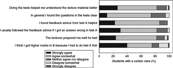 It is also obvious that students rated the two-stage online tests very highly and appreciated the effect they had on their learning. Results from the student questionnaires signify a much higher satisfaction with feedback for the test in comparison to Cycle 2. Presumably, the two-stage tests increased the “time on task” even further than did the one-stage tests in Cycle 2. More importantly, there is good evidence that students spent this additional time on educationally meaningful tasks. Not only do they tell us that they spent more time revisiting their lecture notes, but the 80% rule also encouraged them to act on the immediate feedback they received if they got questions wrong (Figure 5). Similarly, Butcher, Swithenby, and Jordan (2009) suggest that interactive computer-assisted assessments allowing multiple attempts with built-in feedback can engage students in meaningful learning activities, asking them to act on feedback “there and then”.