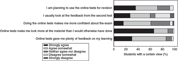 In the second survey, more than 80% agreed that the weekly online tests gave them plenty of feedback on their learning and that the tests made them look at lecture material more than they would otherwise have done (Figure 6). About 70% were planning to redo the tests for exam revision. Around 60% felt more confident about the exam because of the tests, and said that they usually look at the feedback for the second test which was revealed a week after the deadline. The third survey concentrated on how useful the students found the online tests for their exam revision. 40% of the respondents actually repeated the online tests as part of their revision, and another 40% included the feedback they got. Over 90% agreed that they found the weekly online tests very useful (60%) or somewhat useful (36%) for their learning (data not shown).