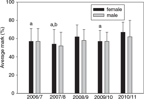 Average exam marks±standard deviation (%) of male and female students (a, b= significantly different from 2010/11 and 2009/10, respectively).