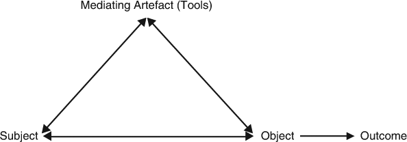 Expansive Learning (Engeström 1987) derives from Activity Theory, which was formulated from Vygotsky's (1978, 1927/1997) theory of human development. Activity Theory argues that human actions are not a direct transmission between subject and object, but are mediated through the use of (broadly defined) tools. Activity Theory is an appropriate lens for this paper because it enables an exploration of how digital technologies impact on other aspects of higher education, including social relations. Scanlon and Issroff (2005) have previously used Activity Theory to analyse the impact of technologies in higher education, and, at a school level, Hardman (2005) used Activity Theory to analyse the impact of technology in teaching mathematics in deprived communities in South Africa. In both cases, the researchers noted the impact of new technologies on the division of labour within a classroom setting. Vygotsky (1978) represented the first generation model of human activity as a simple triangle (Figure 1). Vygotsky's model illustrates his theory that human beings do not interact directly with their environment. Instead, they use tools (including signs and codes as well as physical apparatus) as mediators.
