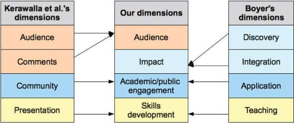 We substituted the “community” dimension of Kerawalla et al. with Academic and public engagement, also to encompass Boyer's “application” dimension. This includes looking at a wider relationship with a specialist and non-specialist community.