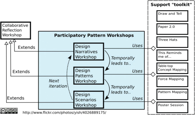 | Participatory Pattern Workshops | The Participatory Methodology for Practical Design Patterns is a process by which communities of practitioners can collaboratively reflect on the challenges they face and the methods for addressing them. The outcome of the process is a set of design narratives, design patterns and future scenarios situated in a particular domain of practice. At the heart of this process are three Collaborative Reflection Workshops. |