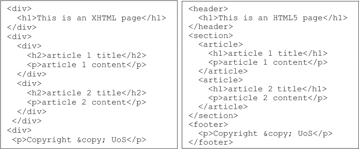 HTML 5 promises a fundamental restructuring of information on the Internet by allowing websites to internally mark their content areas explicitly with elements such as <header>, <section> and <article>. Figure 1 shows a comparison between content markup for XHTML and HTML 5, and demonstrates how information meaning can be more clearly identified at the markup level using HTML 5. Whilst the XHTML version is structured as a document into sections, the sections represented by <div> elements are literally meaningless.