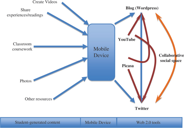 While Web 2.0 tools enable learner-generated content, Web 2.0 tools used on mobile handheld devices enable bridging of different learning contexts (bridging between a teacher controlled classroom (formal) and learning driven by the student outside the classroom (informal context) (Cochrane and Bateman 2010). The ubiquitous nature of mobile devices and connectivity facilitates learner-generated context defined as the learners interaction with the surrounding (virtual online spaces or physical spaces) of his/her choice or the learners interaction with a collection of resources such as digital artefacts, people and other objects curated by the teacher, another individual or a community to further its own learning (Luckin 2008; Luckin et al. 2007; Luckin et al. 2008a, 2008b).