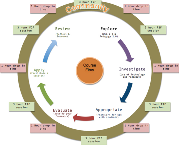 The SLT course ran over the period of a semester, with six 3-hour-long face-to-face sessions. Figure 1 illustrates the structure of the course, within the framework of an intentional COP.