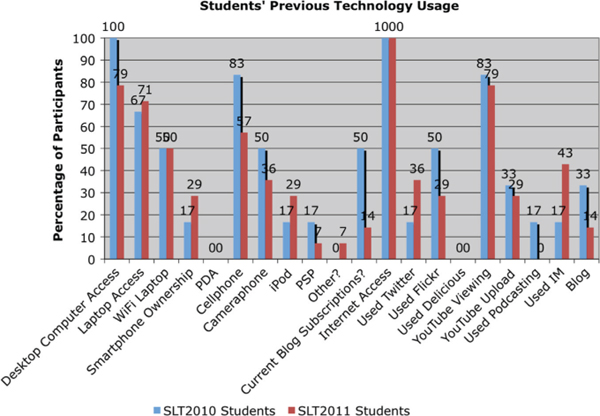 Figure 2 compares the responses of the 2010 and 2011 SLT students to the precourse survey. Figure 2 indicates that while the SLT participants all had computer and Internet access, and the majority owned a mobile phone, most of their web experience had previously been as consumers of information and media rather than as producers. There was minimal use of interactive web 2.0 technologies prior to the course, with those who were already engaging in web 2.0 having previously worked with the authors on projects; in particular, half of the 2010 students had already established the use of blogging and photo sharing via Flickr.
