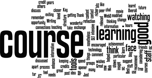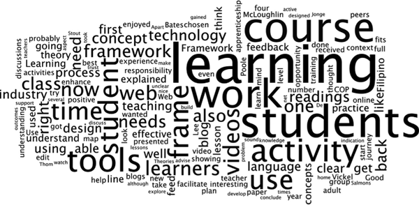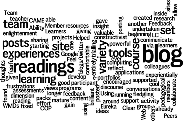 The students’ responses in their final reflective blog posts and the end-of-course survey were overwhelmingly positive about the impact of the course on their conceptions of pedagogy and mobile web 2.0. These are collated in a word cloud in Figure 3.