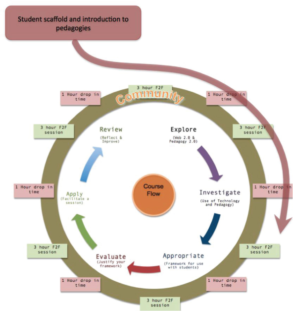 We also allowed a certain amount of negotiation with the students around the course goals and assessment activities (as far as the redesigned course descriptor would allow) – allowing the COP that developed to be unique to the participants, who tended to find it a new experience; this was reflected in the different emphases of each iteration of the course in 2010 and 2011.