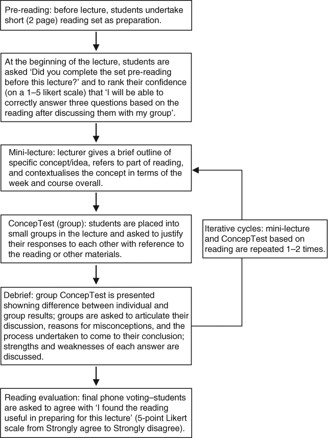 In addition to the substantive questions posed, we also asked some questions whose purpose was purely to assess the benefits of our use of mobile phone voting to engage students through explicitly requiring preparation. Thus, at the beginning of each lecture, students were asked if they had completed the pre-reading, and how confident (on a 1–5 Likert scale) they were about their ability to correctly answer the questions posed. At the end of each lecture, students were asked if they found the pre-reading useful to their understanding of the issues addressed. The project implementation and research design is illustrated in Appendix.