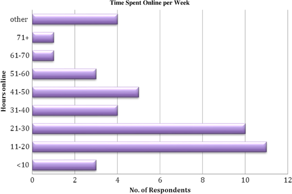 Chart 1 demonstrates how 48% of respondents spend between 11 and 30 hours online per week (n=20), equating to between 1.5 and 4.2 hours per day. However, some students spend considerably less – two respondents spend less than 10 hours online per week – and some spend considerably more – five respondents spend more than 51 hours per week online. There were also four “other” responses to this question, including: “Many/Too many” and “Continuously”.