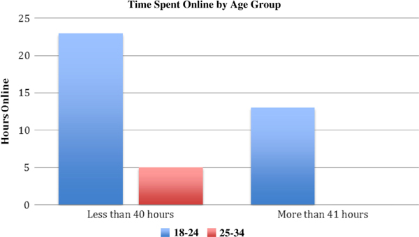 Chart 2 demonstrates how respondents in the 25–34 age category are less likely to spend significant time online – all of whom spend less than 40 hours online per week. In contrast, 13 respondents (31%) spend greater than 41 hours online per week, all of which are in the 18–25 age category.