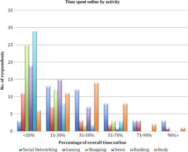 79% of respondents engaged in social networking (n=33) between 11% and 70% of their overall time online, just as they did in activities related to study (79%, n=33).