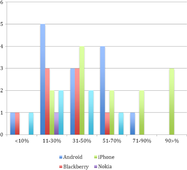 A total of 24 respondents (57%) with smartphones use them for less than 50% of their overall Internet activity, whilst 18 (43%) use them for more than this.