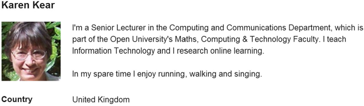It is recommended practice to include a photograph in a personal profile. Nicol, Minty, and Sinclair (2003) described a system, where ‘each online contribution is accompanied by a digitized thumbnail picture of the sender in order to personalize contributions with a social reference’ (p. 273). The forums in the Moodle virtual learning environment adopt this approach, with messages including a photo or image representing the sender (see Figure 1). Clicking on the user’s name then takes you to their profile (Figure 2).