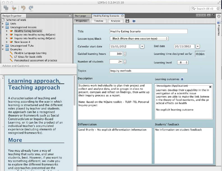 To model the “healthy eating” lesson in the Learning Designer, we took the lesson descriptions and transformed them into properties and “teaching–learning activities” (TLAs) in a block of sessions.