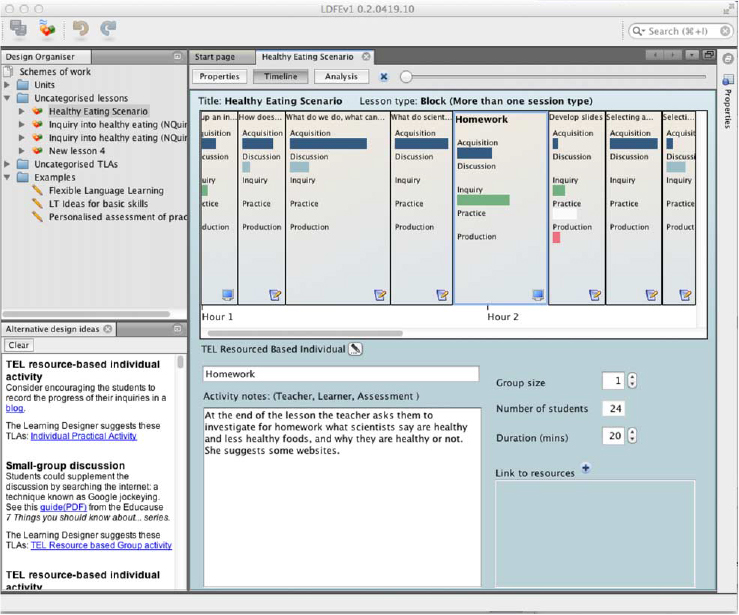 The detailed pedagogical features of the learning design are expressed in the Timeline screen, where the teacher-designer4 can drag and drop pre-defined TLAs, and customise them in terms of name, activity notes, group size, duration, and so on (Figure 2). TLAs are sized on the basis of their duration, and they contain an editable analysis of the likely learning experience, in terms of acquisition, inquiry, discussion, practice and/or production. The software offers suggestions for alternatives on the basis of the properties of the currently highlighted TLA (Figure 2, bottom left).