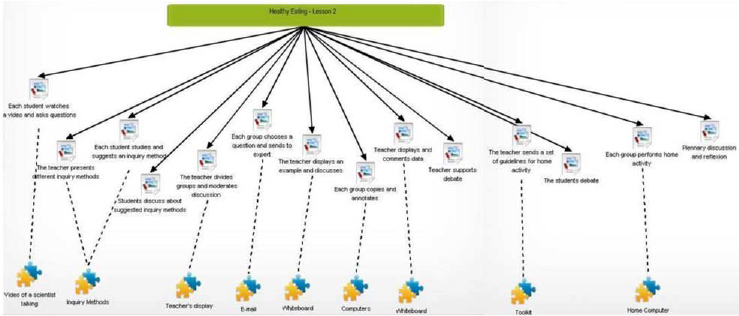 CADMOS conceptual model of the “healthy eating” lesson, showing activities (middle row) and resources (bottom row).