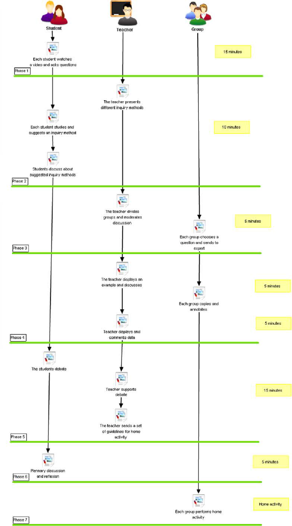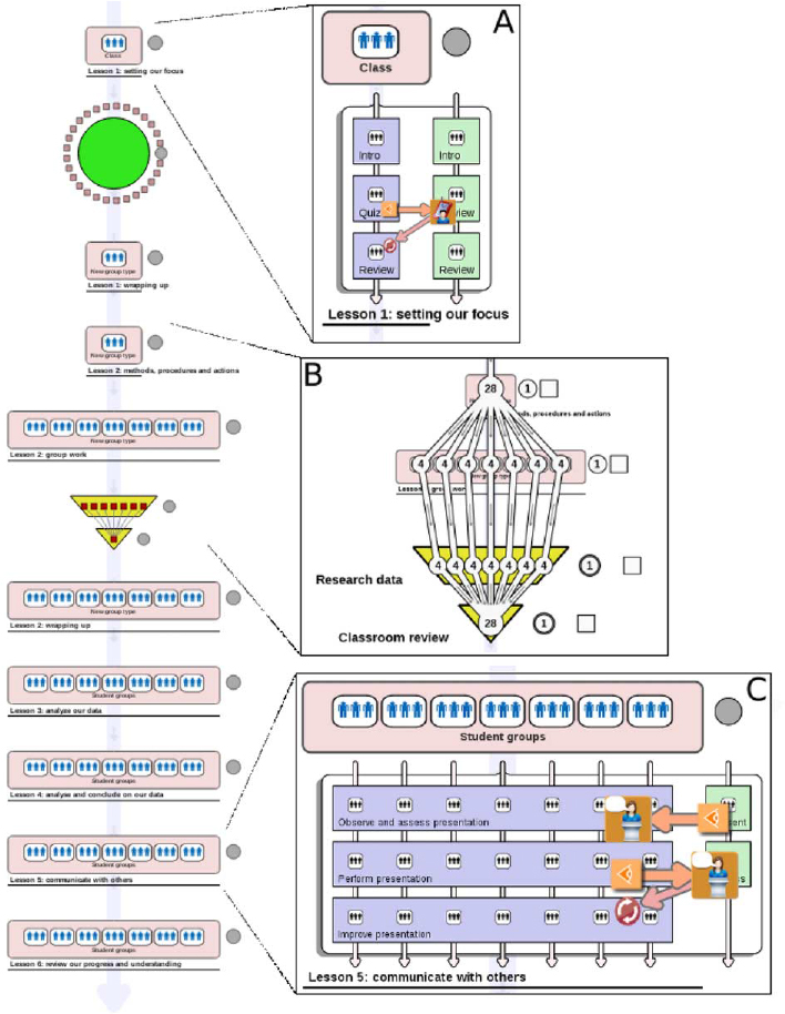 The flow model of the lesson, which we created next, is shown in Figure 6. In this model, activities are set in vertical “swim lanes” in chronological order and have been divided into seven phases (i.e. sets of activities), as suggested by the original description of the lesson.
