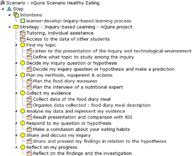 The “healthy eating” lesson, as modelled in ScenEdit, is shown in Figures 8 and 9. As can be seen in Figure 8, the different types of components in an ISiS scenario are represented by symbols: triangles denote steps, squares denote intentions, circles denote strategies and clapperboards denote interactional situations. The main aim of the lesson was for pupils to develop skills in undertaking inquiry-based learning tasks. The teaching method comprised a sequencing strategy in eight phases, modelled on the activities in the nQuire tool (e.g. “Collect my evidence”). Each of these eight activities was modelled through one or more interactional situations (e.g. “Collect data from the food diary meal” and “Organise data collected”).