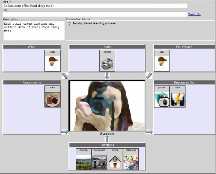 Figure 9 shows the ScenEdit screen on which the interactional situations are described. In terms of tools, each student needs a laptop, a camera and an Internet connection in order to access the nQuire project. In terms of resources, the nQuire website contains the data, either collected by students or provided by the teacher (diagrams, notes, description of objectives, links and so forth). Five roles were identified (pupil, group, class, teacher and nutritional expert), as well as a number of locations (including home and restaurant).
