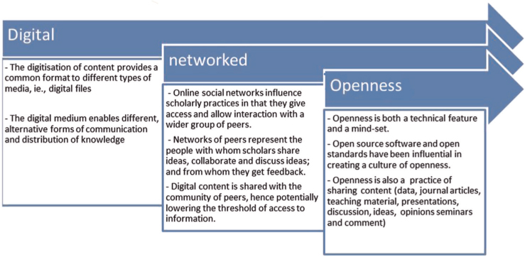 Figure 1 presents the three main features of digital scholarship practices. Digital technologies – the Web – have become a conduit for supporting scholarly practices. It enables the digitisation of content and alternative forms of communication and distribution of knowledge. The possibility of forming and participating in extended networks of peers may influence scholars’ practices as they are exposed to a wide range of ideas and approaches. Scholars’ online networks are a driving force behind the approach to scholarly practices supported by digital media. Although ‘digital’ and ‘networked’ are key features in Weller’s approach to digital scholarship, the main feature transforming academic practices – though dependent on the other two presented above – is openness: