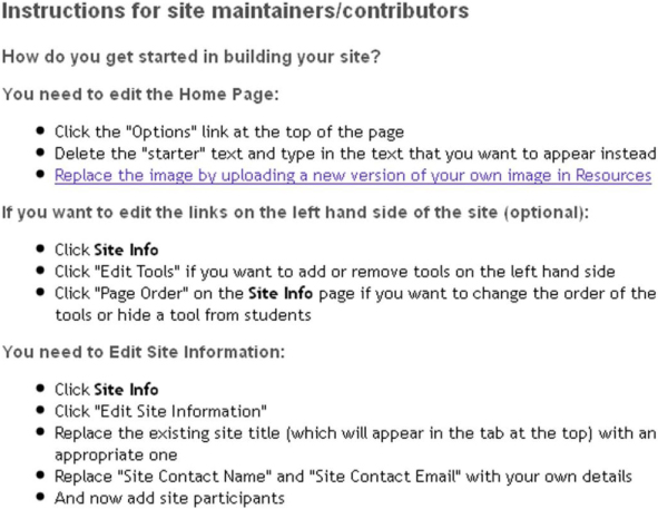 It became apparent that certain components are recommended in all course sites, regardless of their purpose, such as lecturer contact details, and a files and folders area to host and share resources. The list of recommended components (or ‘minimum requirements’) will depend on the particular institution and VLE in use – this is the list used at the British institution in this study: