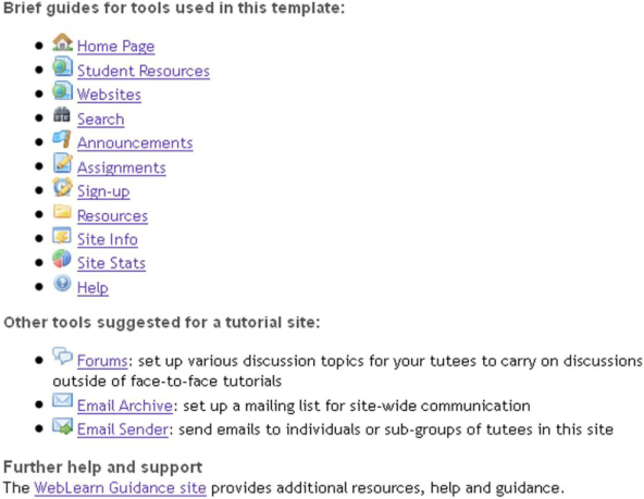 User Roles are the pre-defined, standard roles within our VLE, with their associated default permissions. The User Experience property was translated into detailed help and support for site owners regarding the user interface (‘Instructions on how to build this site’), together with reasons for incorporating certain features or tools, suggestions and links to help guides and tutorials. This property also reflects the recommended Guidance afforded to instructors (Hill et al., 2012). Figure 3 shows the detailed instructions and Figure 4 shows the links to further help and guidance for one of the templates – the ‘Tutorials’ template.