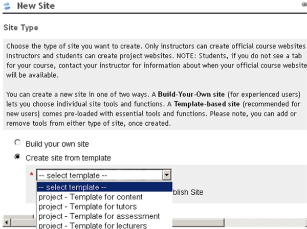 At the British institution, day-to-day management and use of the VLE service is devolved to departments and schools. Staff members can create their own sites, if they have the required permissions to do so from their local VLE coordinator. We thus built the choice of a template into the site creation process (see Figure 5). We purposefully made the default option ‘create from template’, requiring the site owner to select a template from among the choices offered. This helps to promote awareness and use of the templates and thus enhance consistency across all new sites created.