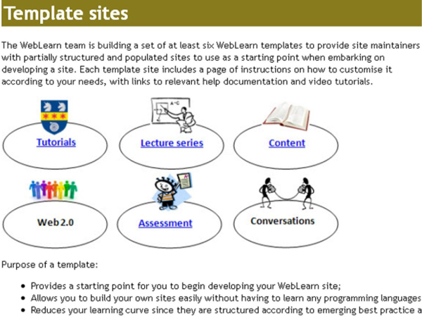 The sample templates are publicly available. The web page displayed in Figure 6 can be accessed from https://weblearn.ox.ac.uk/info – select ‘Template sites’ in the ‘Showcase’ box.