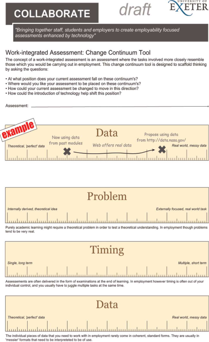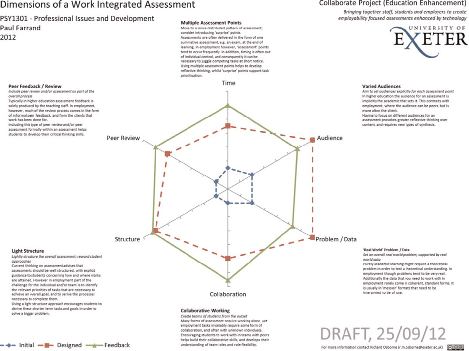 At Exeter, this summary was combined with research from Herrington (2006), Karet and Hubbell (2003) and local stakeholders, in order to develop a new “dimensions” model for the design of authentic assessments.