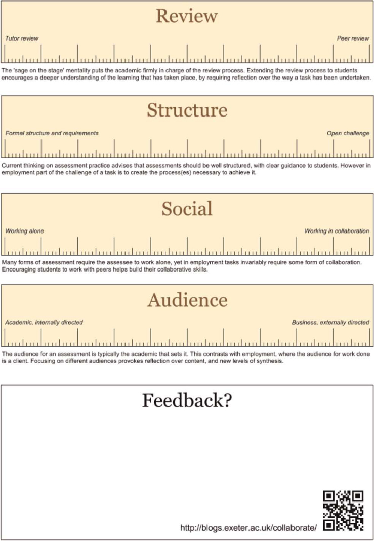 The purpose of the technology “top trumps” was to provide a way of aligning “off the shelf” technologies with the dimensions model. By allocating one to five stars against each technology to quantify their affordance in relation to the six dimensions, specific technologies could then be recommended that should have a positive impact on an assessment designed using the model. In this iteration, technologies were recommended to support the structure and the collaboration dimensions, specifically to support students in developing skills in collaboration, team working and project management.
