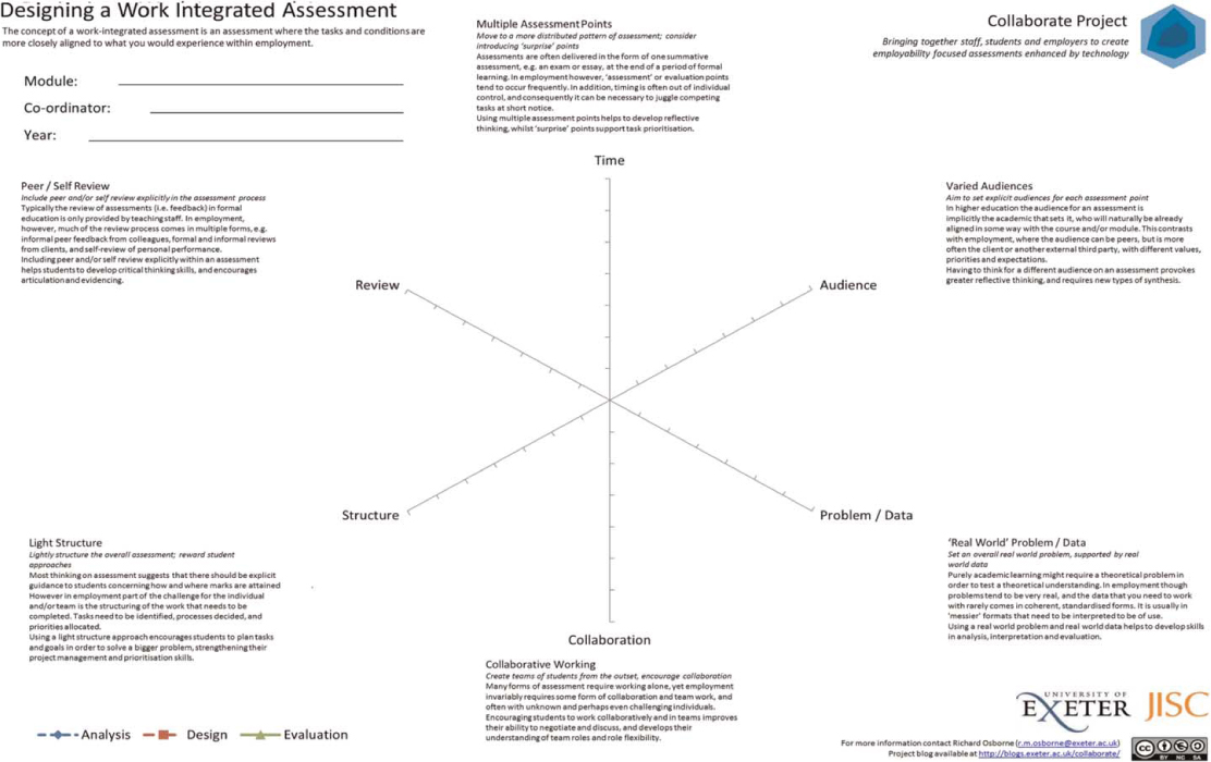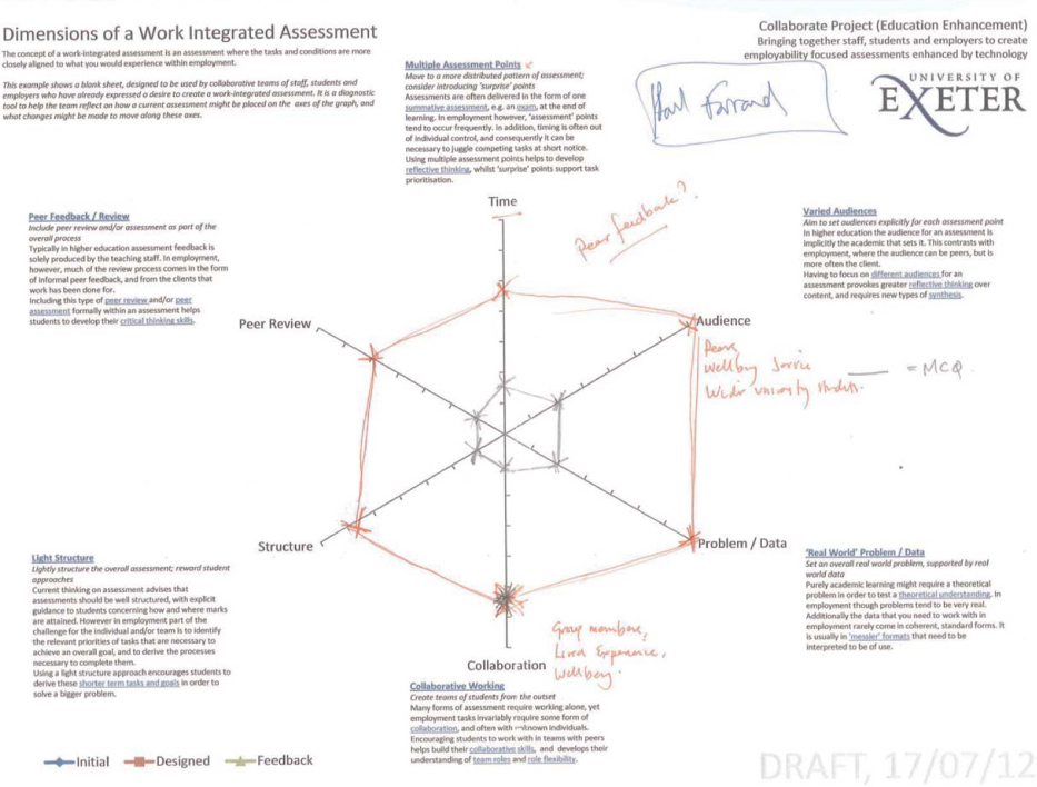The dimensions model was printed on A3 sheets, and used by collaborative design teams of academic staff, together with employers, students and other staff as appropriate, to help change existing assessments. The model is both a thinking tool, using the dimensions to stimulate discussion, and a redesign tool, annotated in order to visualise and agree collective thinking. It is used in three stages, each of which is marked on the chart:
